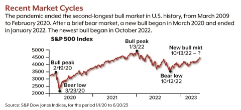On June 8, 2023, the S&P 500 index closed at 4,293.93, just over 20% higher than its lowest recent closing value of 3,577.03 reached on October 12, 2022.(1) According to a common definition of market cycles, this indicated that the benchmark index was officially in a bull market (uptrend) after a bear market (downtrend) that began in January 2022. By this definition, the current bull market began on October 13, 2022, the day after the bear market ended at its lowest point.